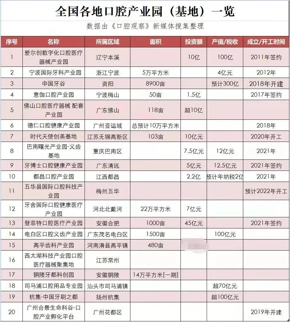 而国家十四五规划提出:“加快发展现代产业体系,推动经济体系优化升级”。口腔健康产业因为巨大的需求,毋容置疑成为各地、行业升级推动的一张牌局。无论是当地政府从地域传统口腔文化土壤里培育产业,还是口腔产业品牌大鳄扩充产能”跑马圈地”,或者自发下的口腔产业集群创新升级的“中国智造”,一大批口腔产业园区的开建浪潮扑面而来。