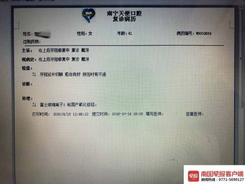 近日,南宁市民李女士向南国早报客户端记者反映称,2016年9月份,她在南宁天使口腔医院(下称天使口腔)做了牙冠之后一直发炎。今年4月20日,广西医科大学口腔医院诊断为慢性根尖周炎、慢性牙周炎,需拆除冠部修复体,之后再做根管治疗。