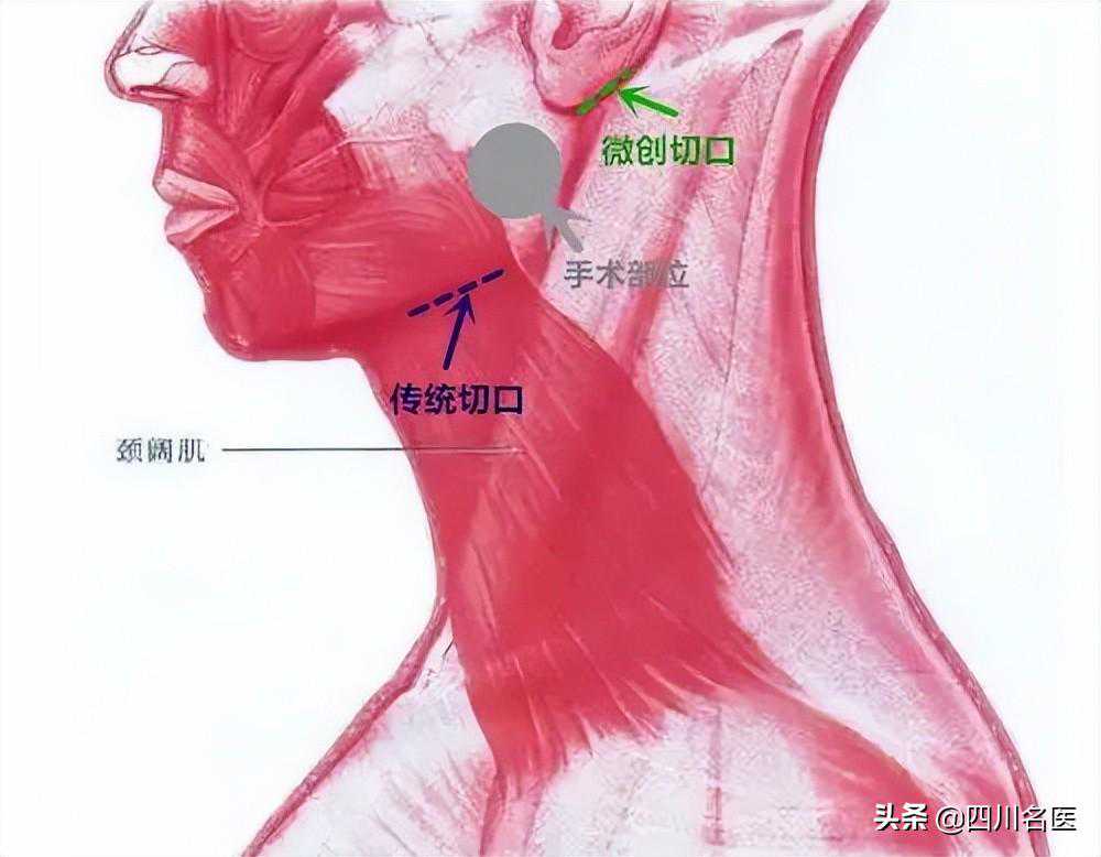以腮腺部位的手术为例,传统手术是在锁骨下、下颌骨内等部位开口,外人若不仔细看倒也不容易发现手术疤痕,但患者术后发生一过性面瘫(一般持续半年左右)等并发症的可能性较大,患者面部表情也会有一段时间不太自然。