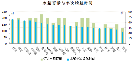 本次样品水箱容量均在118—230ml之间。测试发现,水箱容量大不等于续航时间长。标准冲洗模式下,水箱单次续航时间在33.8—68.5秒之间。20款冲牙器中,水箱单次续航时间最短的33.8秒,为标称生产商/制造商为广东蓝宝智能科技有限公司、标称商标蓝宝(规格型号:CY02)的样品。