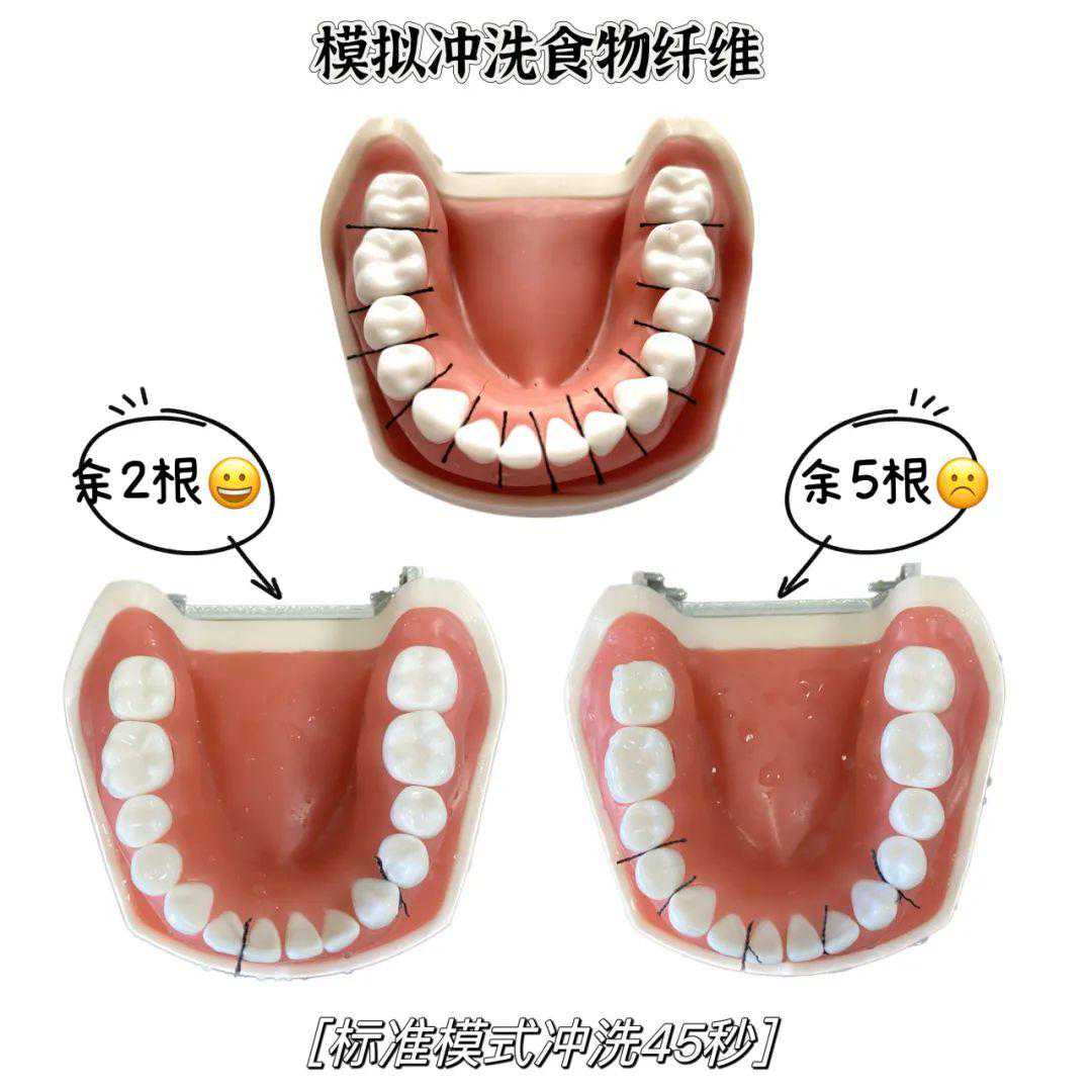 此外,冲牙器素有“水牙线”之称,而牙线一般能在剔除齿缝间食物纤维残留方面发挥独特作用。为了测试冲牙器是否能有效去除齿缝间纤维残留,实验室模拟冲洗场景,先将13根模拟食物纤维嵌入牙模下颌牙缝最紧处,再使用冲牙器标准模式冲洗45秒。