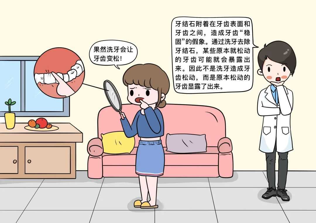 牙结石附着在牙齿表面和牙齿之间,就像糊了一层“泥巴”,造成牙齿“稳固”的假象。如果任由发展,会加重牙龈萎缩、牙根暴露和牙周炎进展。通过洗牙等治疗去除牙结石,恢复牙齿原本的自然状态,某些原本就松动的牙齿可能就会暴露出来。