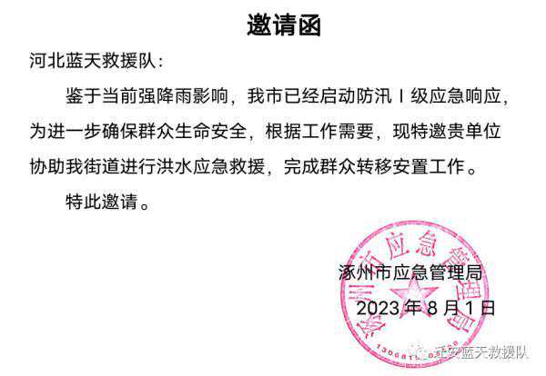 另据河北沧州任丘市融媒体消息,8月1日上午,接到涿州市应急管理局邀请函后,任丘市天狼应急救援队首批8名队员从任丘集结出发,携带3艘救援艇等设备驰援涿州。第二梯队16名队员已出发,预计傍晚到达涿州。该《邀请函》写道:“为进一步确保群众安全,根据工作需要,现特邀贵单位协助我街道进行洪水应急救援,完成群众转移安置工作。”河北唐山迁安蓝天救援队也提到,受涿州应急管理局邀请,省蓝天协调中心指派,迁安蓝天救援队积极响应号召,迅速组织人员力量,共2车10人于10:40携带救援装备出发前往涿州。
