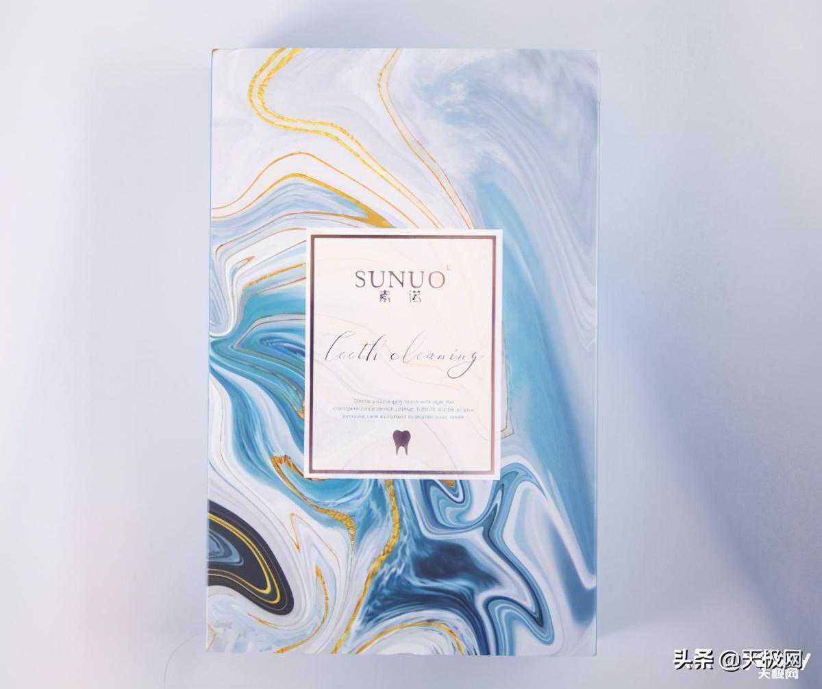 素诺智能可视超声波洁牙仪T11Pro整体的外包装采用的是蓝色基调,盒子正面的流纹非常漂亮,中间印有“SUNUO”和“素诺”的字样,白底更显格调。